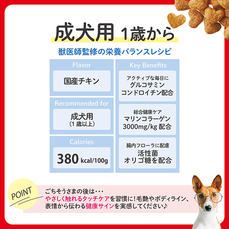 【商品説明】- 成犬の健康と毛並みを維持する国産フード。乳酸菌・コラーゲン配合の優れた栄養バランスで免疫と関節をサポート。