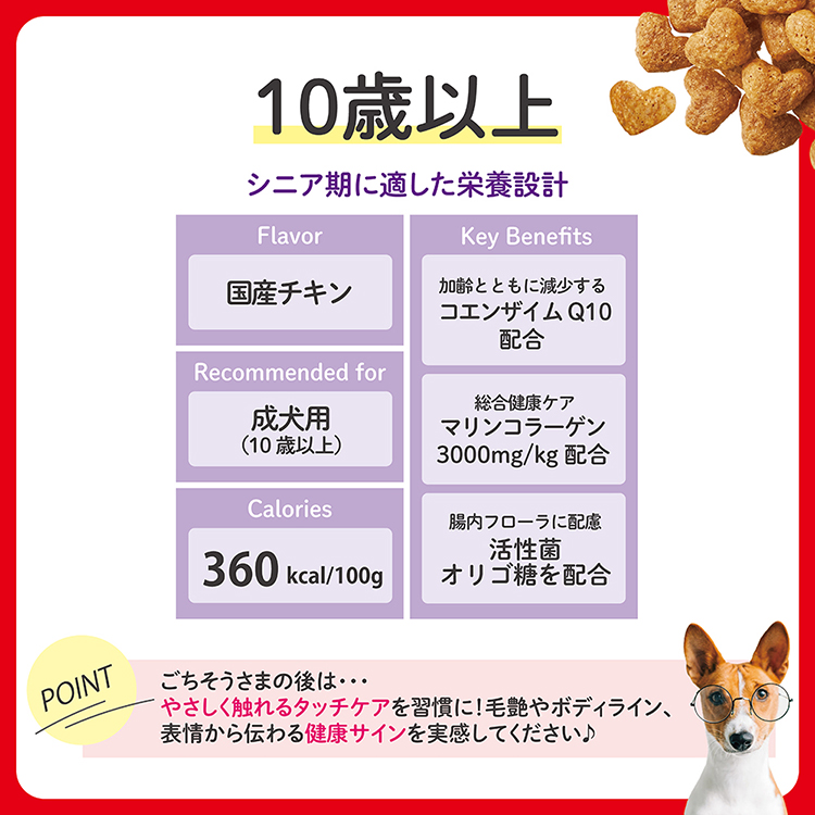 【商品説明】- シニア犬の健康を維持し関節・免疫・毛並みをケア。コエンザイムQ10・乳酸菌配合の国産総合栄養食。