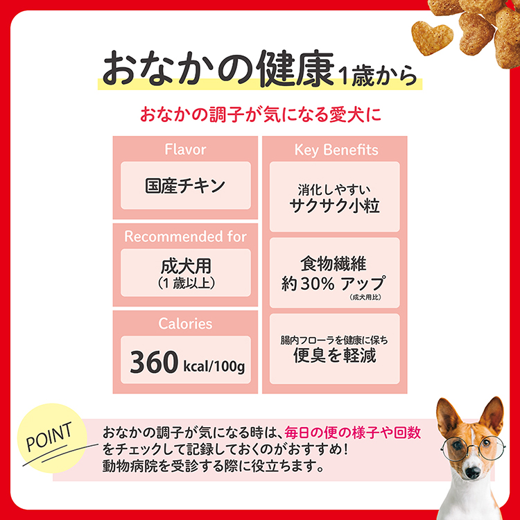 【商品説明】- 活性菌・オリゴ糖・乳酸菌配合で腸内環境の健康を維持。消化に優しいサクサク小粒の国産・成犬用総合栄養食。