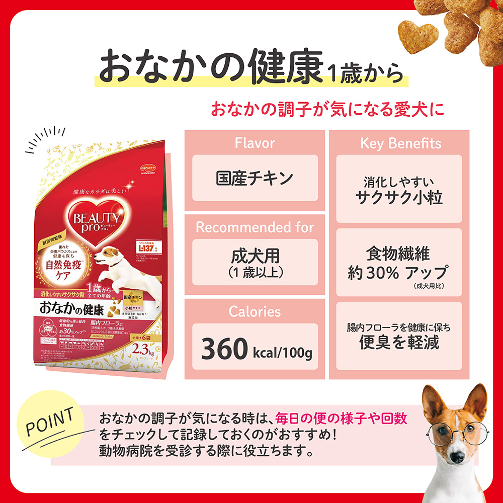 - 健康な便の維持に。 食物繊維 約30%アップ。(ビューティープロ ドッグ 成犬用比) 活性菌・オリゴ糖・乳酸菌(E.フェシウム BIO(加熱菌体))配合。腸内フローラを健康に保ち、便臭を軽減。