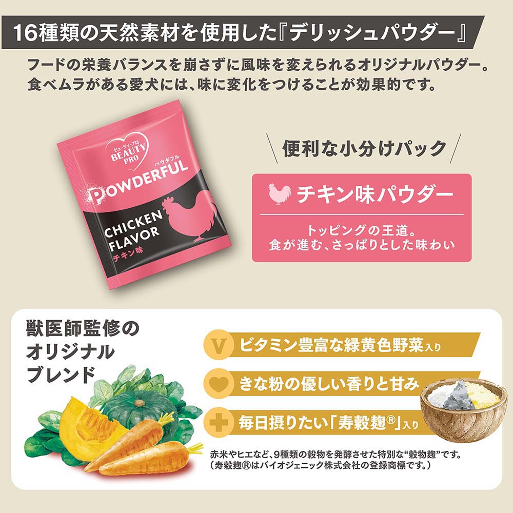 - 【デリッシュパウダーとは】獣医師監修のオリジナルブレンドパウダー。天然素材を贅沢に使用し、ドライフードの栄養バランスを崩さずに風味を変えられます。