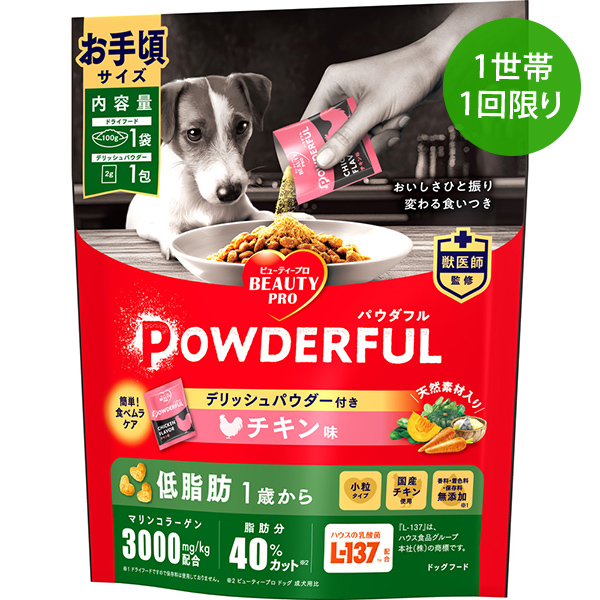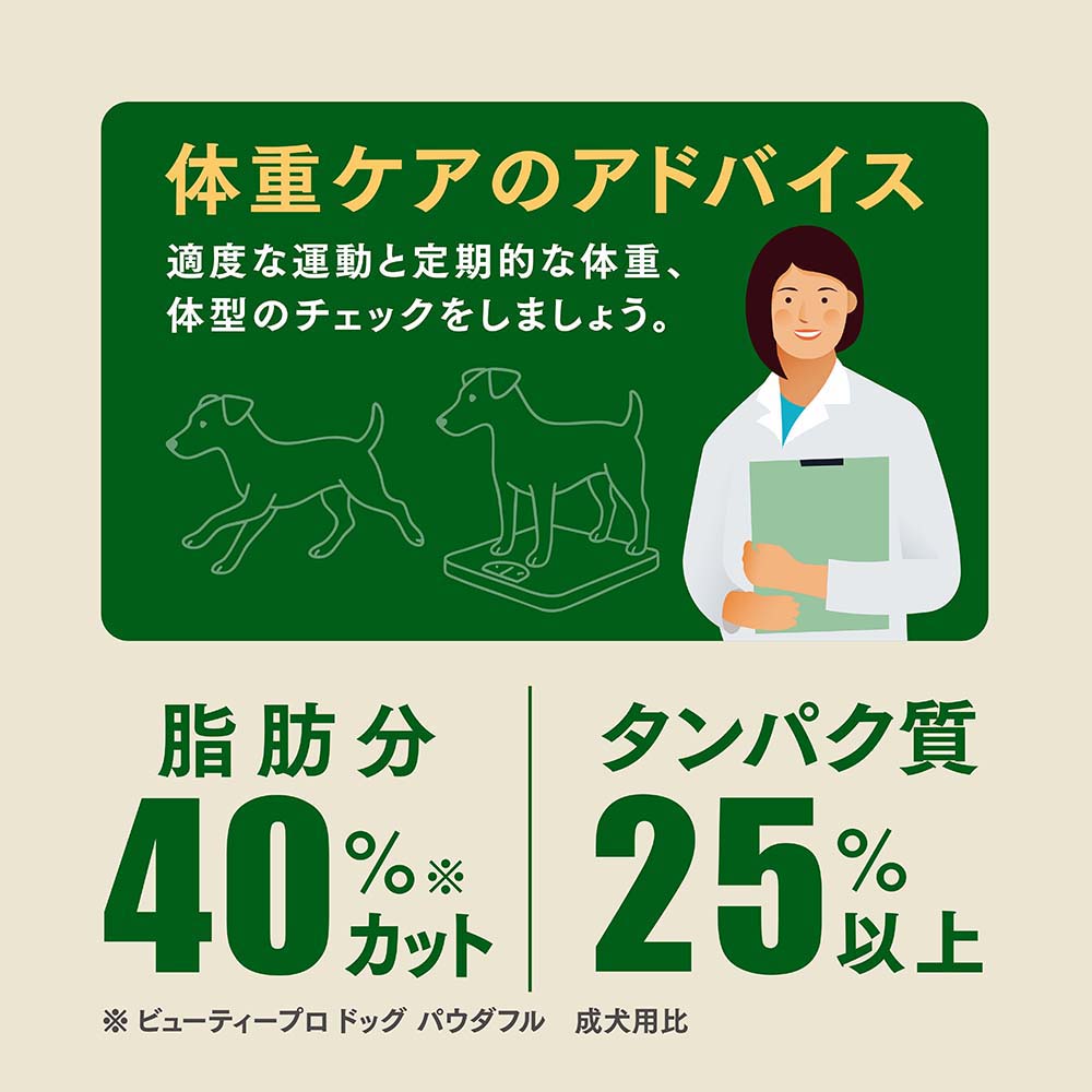 - 脂肪分40%カットのヘルシー設計。(ビューティープロドッグパウダフル 成犬用比)
