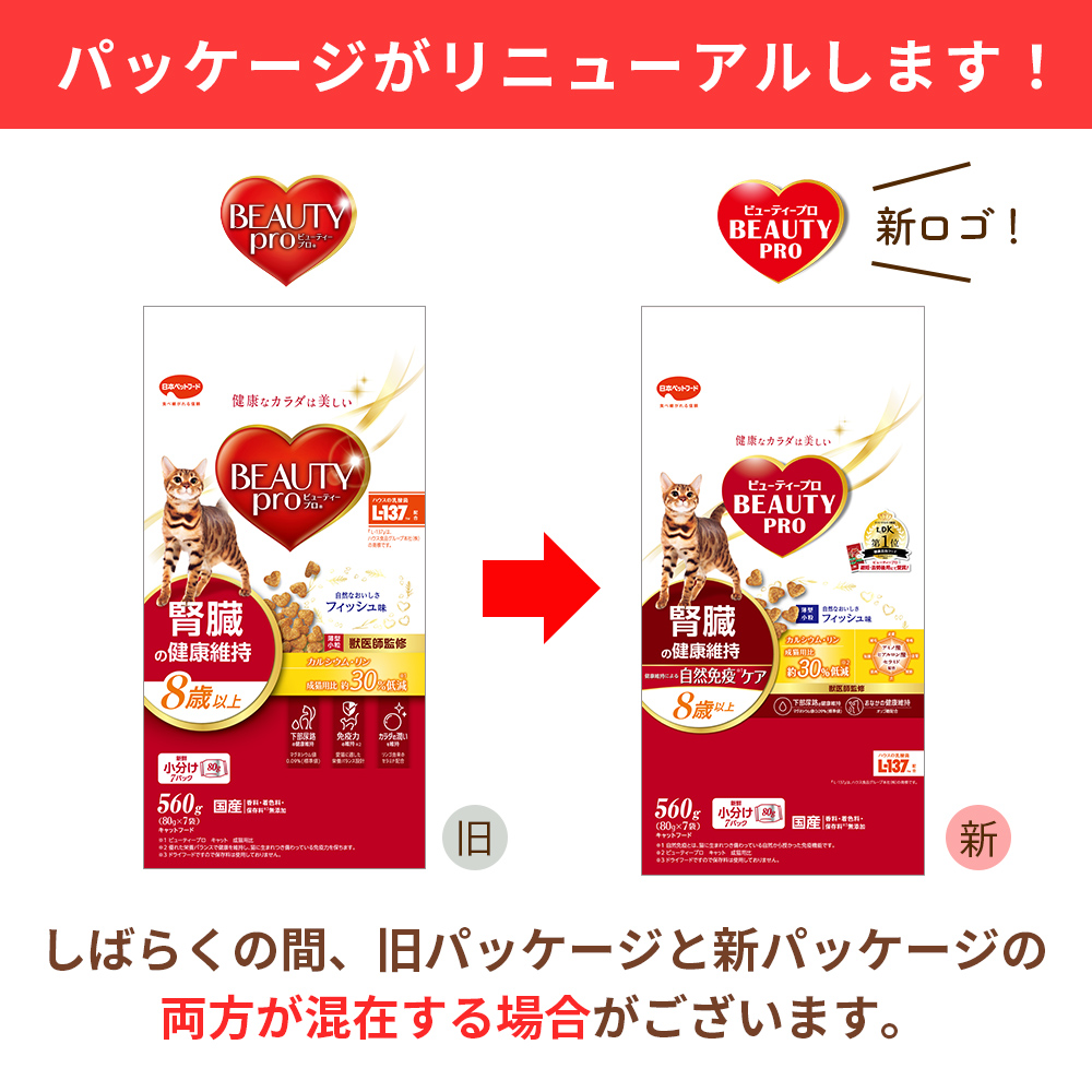 - 腎臓の健康維持のために、カルシウムとリンを低減。(ビューティープロ キャット 成猫用比約30%カット)さらにマグネシウム0.09%(標準値)で下部尿路の健康にも配慮。