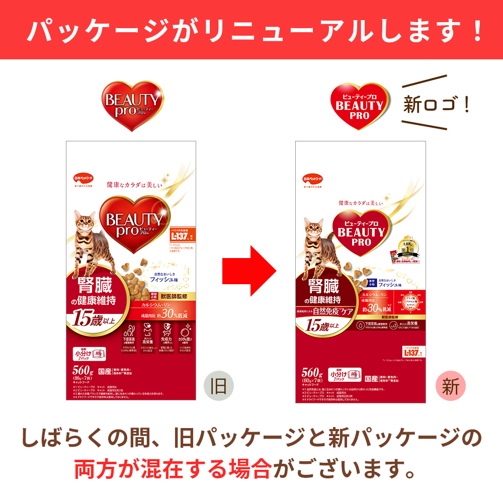 - 腎臓の健康維持のために、カルシウムとリンを低減。(ビューティープロ キャット 成猫用比約30%カット)さらにマグネシウム0.09%(標準値)で下部尿路の健康にも配慮。